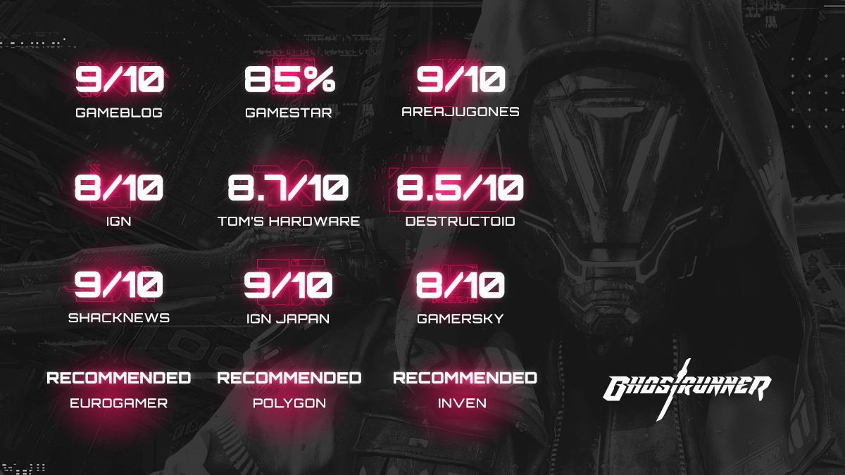 Described as “an exhilarating display of acrobatic first-person platforming” by Eurogamer, “a masterpiece of a parkour action game” by IGN Japan and nominated for IGN’s Best Action Game of 2020, Ghostrunner was the breakthrough hit of 2020, delivering a combination of one-hit close combat and fast-paced platforming in a cyberpunk setting.